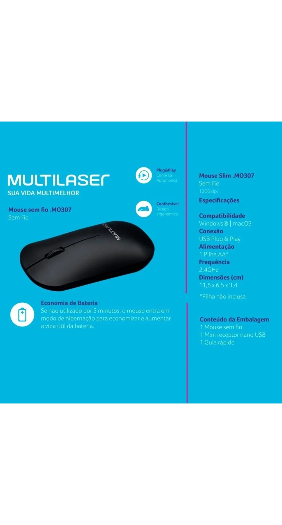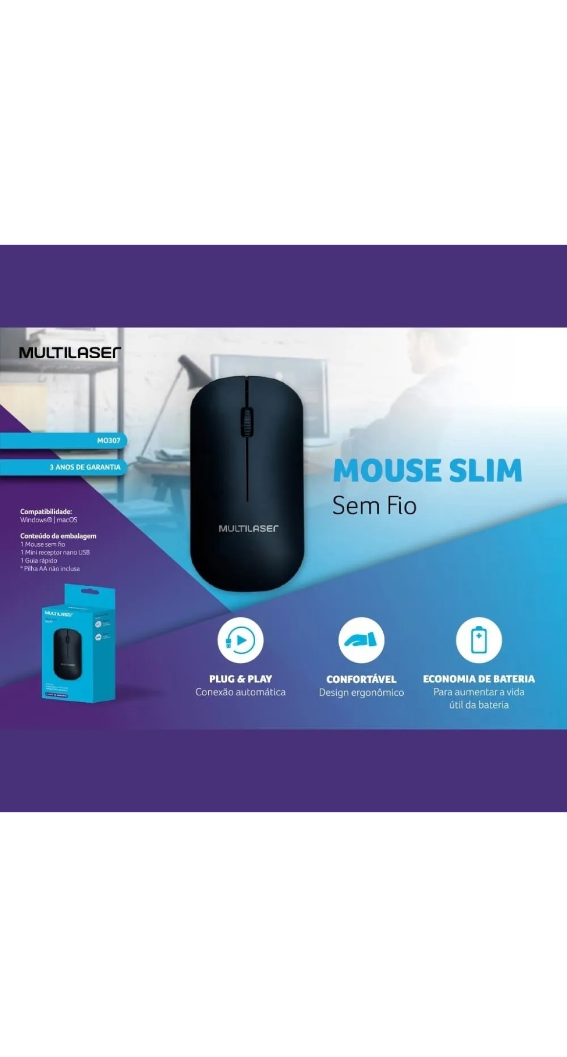 Com uma trajetória de mais de 30 anos no mercado brasileiro, a Multilaser é uma das maiores representantes do segmento de eletrônicos e informáticos. Os mouses da Multilaser têm uma capacidade de resposta rápida e podem ser transportados sem danificar a sua estrutura. Eles são caracterizados por uma textura macia, que favorece os movimentos tornando-os mais leves e proporcionando mais agilidade.